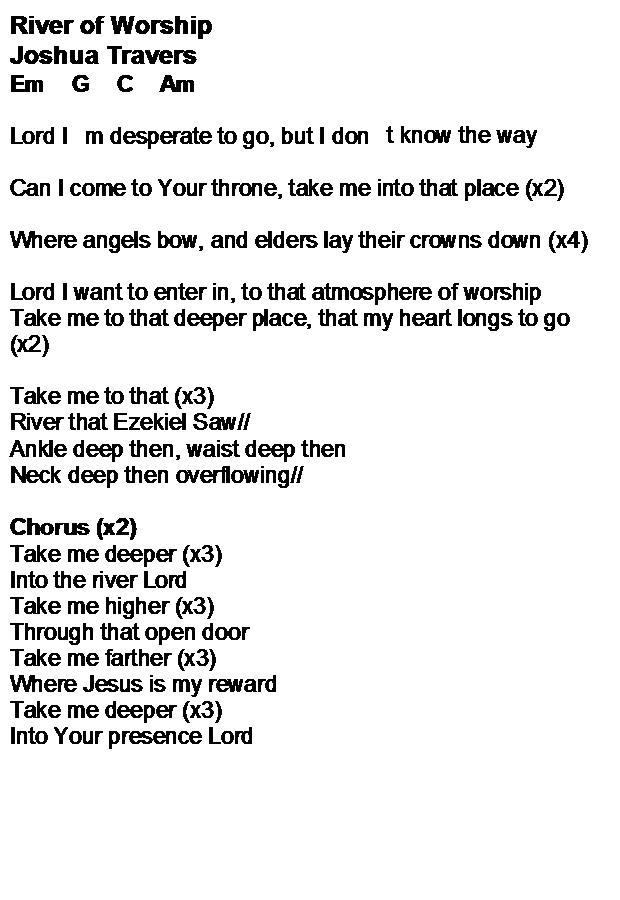 Chord charts are here: Not To Us, Your Face Outshines The Brightest Sun, and River of Worship. RIVER OF WORSHIP IS IN Am!!! (Am – C – F – Dm) (sorry, wouldn’t transpose)